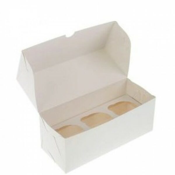 Коробки для 3-х маффинов размером 250×100×100 мм, могут использоваться для упаковки и доставки десертов, кондитерских изделий.