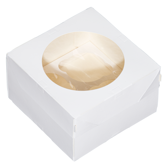 Коробка для торта размером 220×220×110 мм с окном из белого картона подходит для транспортировки и хранения тортов. Коробка легко складывается по линиям изгиба, боковое и верхнее окно позволяют рассмотреть содержимое, не открывая коробку.