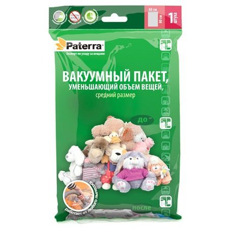 Вакуумный чехол Paterra размером 70×105 см, работающий от пылесоса, предназначен для компактного хранения и перевозки одежды, постельных принадлежностей, мягких игрушек и других вещей. Обеспечивает герметичную защиту вещей от влаги, пыли, моли и запаха.
