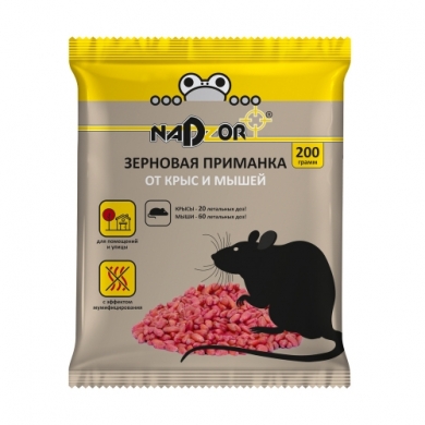 Зерновая приманка от мышей и крыс Nadzor (500 г) используется для борьбы с грызунами в доме или на участке. Средство представляет собой мелкие гранулы из измельчённого зерна, пропитанного активным действующим веществом.