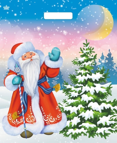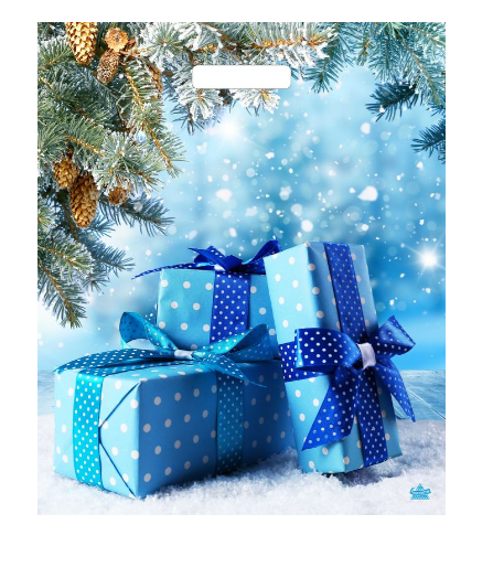 Новогодний пакет с вырубной ручкой, размер 38*45+5см служит для упаковки небольших подарков, предметов одежды, продуктов.
