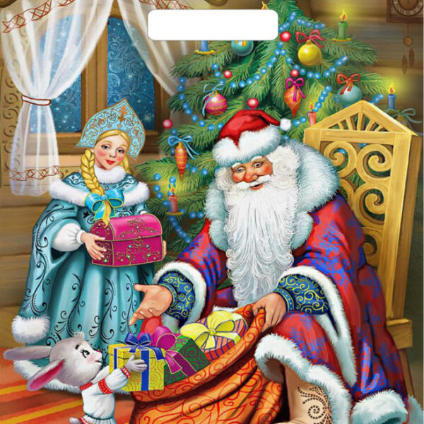 Новогодний пакет с вырубной ручкой, размер 38*45см, плотность 60мк. Пакет служит для упаковки небольших подарков, игрушек, косметических средств. Продается по 50 штук.