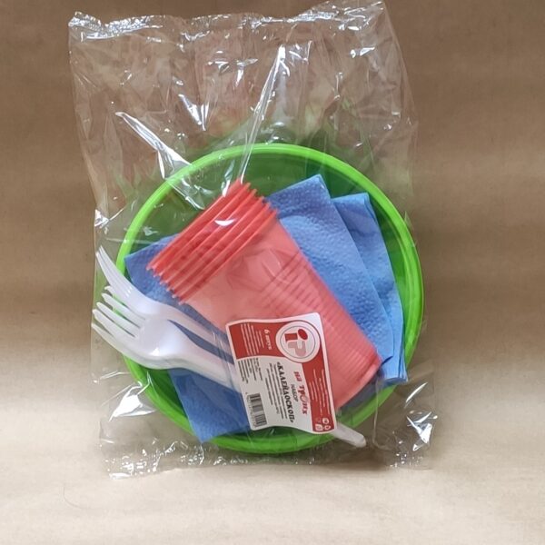 Набор одноразовой посуды "Светофор": тарелка 205мм, тарелка 170мм, стакан цветной 200мл, салфетка, вилка, нож. Используется для холодных и горячих пищевых продуктов. Подходит для разных мероприятий, пикников, туристических походов.