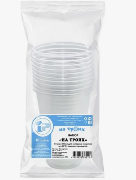 Набор одноразовых стаканов, количество 10 штук. Упакован в прозрачную пленку. Служит для употребления напитков в путешествиях, на пикниках, различных мероприятиях.