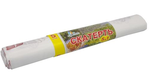 Скатерть одноразовая в рулоне. Изготовлена из полиэтилена, размер 110*180см, в рулоне 5 штук (разделяются по перфорации), плотность 35мкм. Станет отличным украшением для праздничного стола на любом мероприятии.