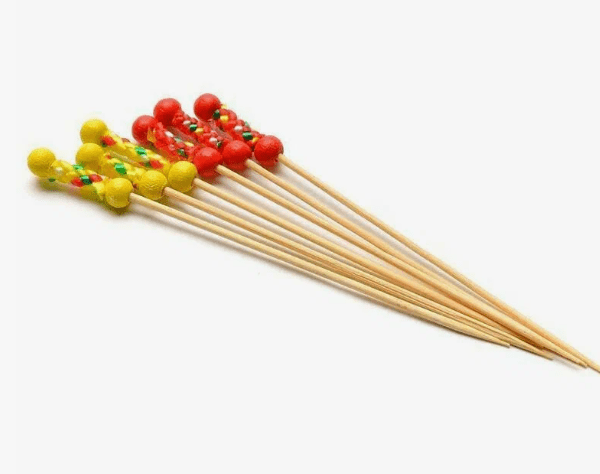Деревянные шпажки «Пика» длиной 9 см для канапе «Рио» красно-жёлтого цвета от Tambien (100 штук в упаковке) используются для сервировки и украшения закусок и канапе небольших размеров.