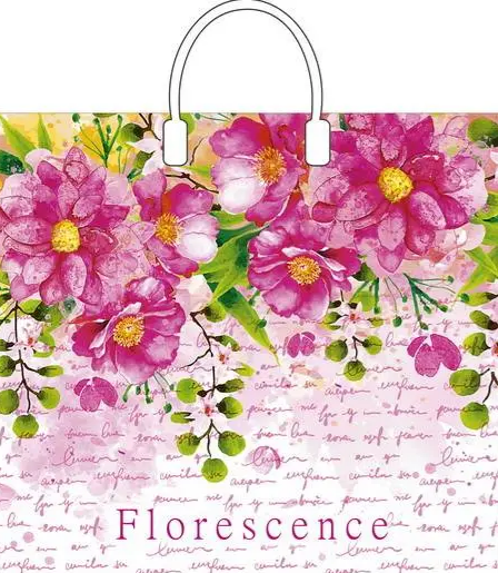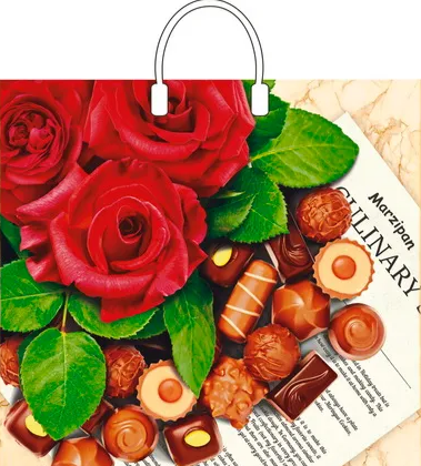 Пакет с пластиковой ручкой, плотный, глянцевый, размер 36*34*5см. Применяется для бытовых нужд и как подарочная упаковка.