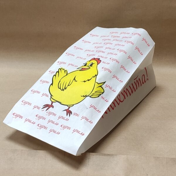 Гриль-пакет размером 200×100×320 мм с печатью «Курочка» и плоским дном подходит для упаковки продуктов, куриц-гриль, готовых закусок.