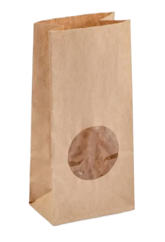 Пакет бумажный изготовлен из плотной 2-х слойной Крафт бумаги с прозрачным окном. Размер 100*70*60*200 мм. Используется для упаковки продуктов питания, косметики, сувениров.