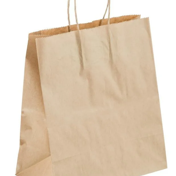 Бумажные крафт-пакеты размером 320×200×370 мм, плотностью 70 г/м² и кручёными ручками можно использовать для упаковки, переноски и хранения продуктов питания и бытовых товаров.