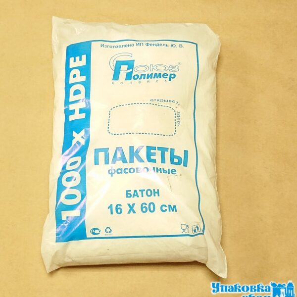 Пакеты фасовочные, размер 16*60см, плотность 6мк. Количество 1000 штук. Используются для фасовки багетов, батонов, хлебобулочных изделий. Пакеты удобно доставать через перфорированное отверстие сверху упаковки.