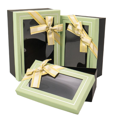 Набор прямоугольных коробок 3 в 1 с бантом и окном зелёного цвета можно использовать для упаковки подарков. Благодаря прочности и привлекательному виду коробки можно использовать повторно, что делает их экологичным и практичным вариантом.