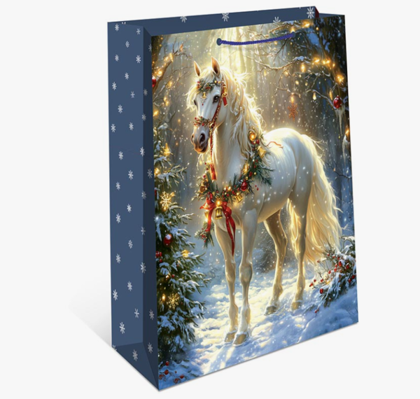 Новогодняя бумажная подарочная сумка-пакет размером 26*32*10см изготовлена из прочного ламинированного картона, имеет надежные веревочные ручки. Сумка идеально подойдет для упаковки подарка к новогоднему празднику!
