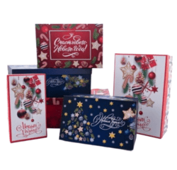 Набор прямоугольных новогодних коробок с интересным дизайном поможет оформить запоминающийся яркий подарок, который приятно дарить и получать.
