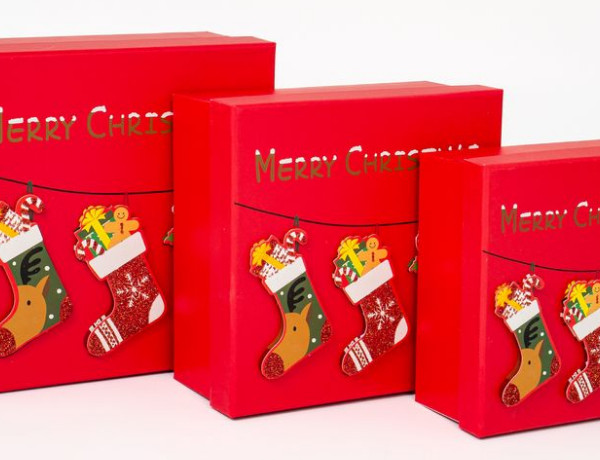 Набор коробок НГ 3в1 квадрат 20*20*9,5/15,5*15,5*7,5см Носки на красном фоне