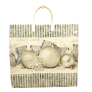 Пакет новогодний праздничный с пластиковой ручкой, размер 38*35*10 см. Красивый плотный пакет подходит для использования в быту и как подарочная упаковка. Продается по 10 штук.
