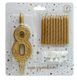 Набор свечей классическое золото для торта с цифрой 8 + 10 свечей с подставкой — служит для украшения праздничного торта.