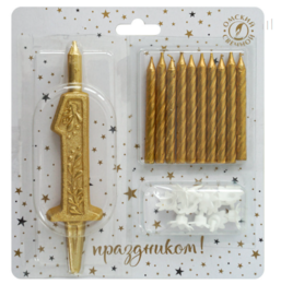 Набор свечей классическое золото для торта с цифрой 1 + 10 свечей с подставкой — служит для украшения праздничного торта.
