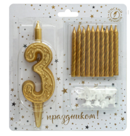 Набор свечей классическое золото для торта с цифрой 3 + 10 свечей с подставкой — служит для украшения праздничного торта.