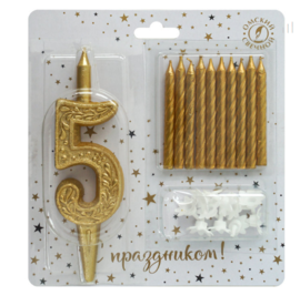 Набор свечей классическое золото для торта с цифрой 5 + 10 свечей с подставкой — служит для украшения праздничного торта.