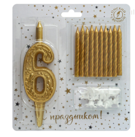 Набор свечей классическое золото для торта с цифрой 6 + 10 свечей с подставкой — служит для украшения праздничного торта.
