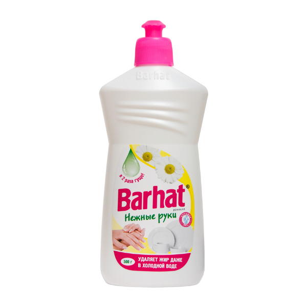Средство для мытья посуды «Бархат Нежные ручки» объёмом 500 мл с ароматом ромашки предназначено для удаления жира даже в холодной воде и не раздражает кожу рук.