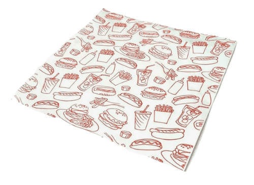 Обёрточная бумага «Гамбургер» размером 305×305 мм (в упаковке 500 листов) предназначена для упаковки пищевых продуктов. Материал — пищевая бумага и парафин.