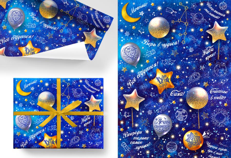 Глянцевая бумага «Звездное небо» плотностью 80 гр/м² в рулоне размером 70 см × 10 м используется для упаковки подарков, оформлении букетов, создании декоративных элементов (с помощью бумаги можно реализовать творческие идеи, например, в скрапбукинге), упаковки товаров.