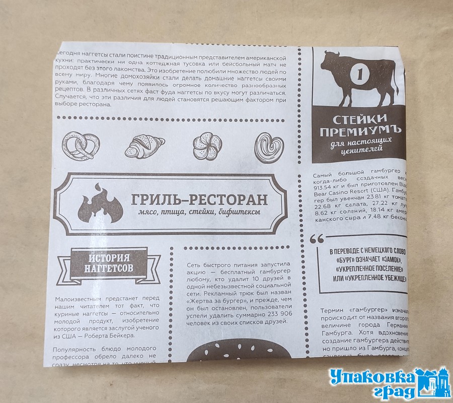 Такая бумага предназначена для упаковки продуктов, чтобы защитить их от внешнего воздействия, сохранить свежесть и запахи. Бумага обладает специальным парафинированным слоем, который придаёт ей жиро- и влагозащитные свойства.