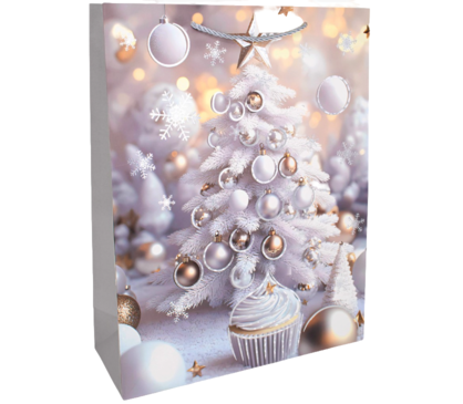 Новогодняя бумажная подарочная сумка-пакет размером 32*45*11см изготовлена из прочного ламинированного картона, имеет надежные веревочные ручки. Сумка идеально подойдет для упаковки подарка к новогоднему празднику!