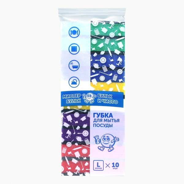 Губка для посуды универсальная. Мягкая сторона – для повседневной и деликатной очистки. Грубый слой справляется с самыми трудными загрязнениями. Тщательно очищает, не повреждая деликатную поверхность. В упаковке 10 штук.