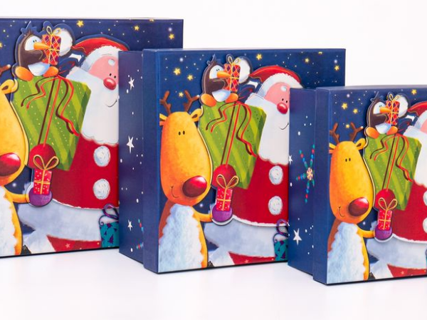 Набор прямоугольных новогодних коробок с интересным дизайном поможет оформить запоминающийся яркий подарок, который приятно дарить и получать.