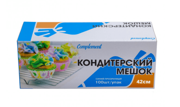 Кондитерский мешок Complement длиной 42 см (в упаковке 100 штук) используют для нанесения и приготовления фигурных элементов из крема, теста, взбитых сливок и других материалов.