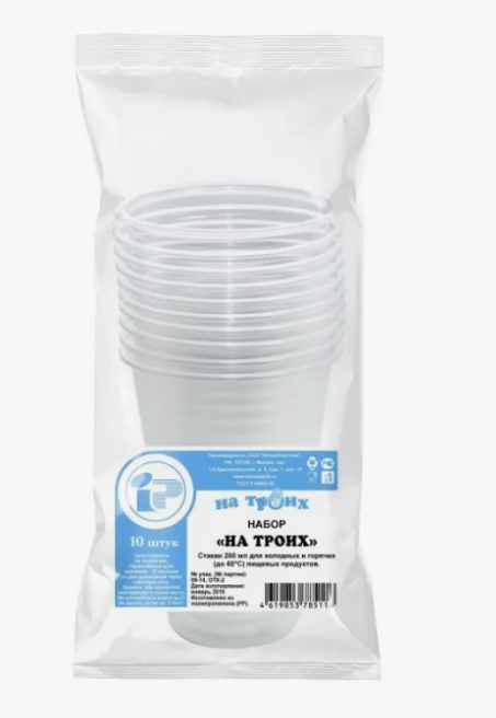 Набор одноразовых стаканов, количество 10 штук. Упакован в прозрачную пленку. Служит для употребления напитков в путешествиях, на пикниках, различных мероприятиях.
