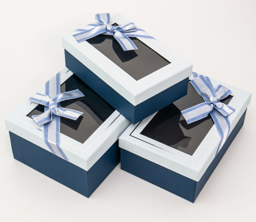 Набор коробок 3в1 прямоугольник 23х16х9,5/ 21х14х8/ 19х12х6,5см, с бантом, окном, синий