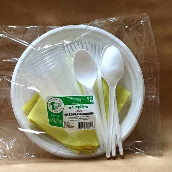 Набор одноразовой посуды “Пикник” на 6 штук: тарелка 205мм, стакан цветной 200мл, вилка. Используется для холодных и горячих пищевых продуктов. Подходит для разных мероприятий, пикников, туристических походов.