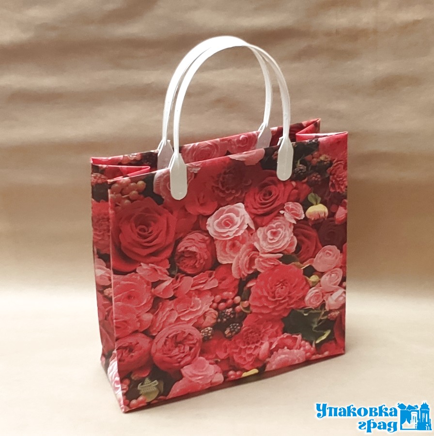 Пакет с пластиковой ручкой, плотный, глянцевый, размер 36*34*5см. Применяется для бытовых нужд и как подарочная упаковка.