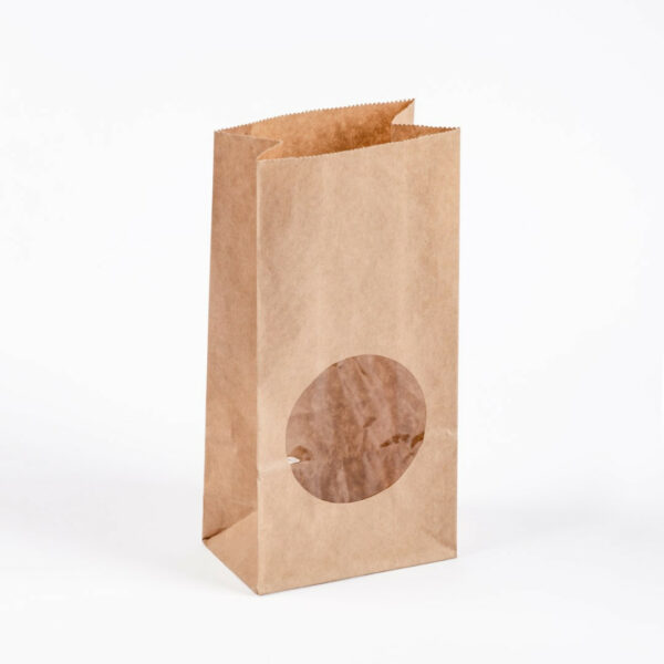 Пакет бумажный изготовлен из плотной Крафт бумаги с прозрачным окном. Размер 100*60*200 мм. Используется для упаковки продуктов питания, косметики, сувениров.
