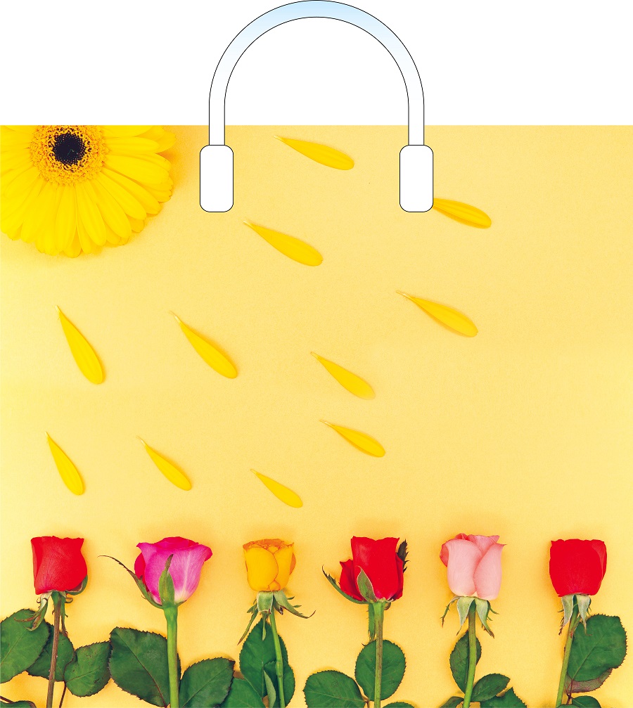 Пакет с пластиковой ручкой, плотный, глянцевый, размер 36*34*5см. Применяется для бытовых нужд и как подарочная упаковка.