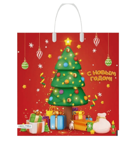 Пакет новогодний праздничный с пластиковой ручкой, размер 38*35*10 см. Красивый плотный пакет подходит для использования в быту и как подарочная упаковка. Продается по 10 штук.
