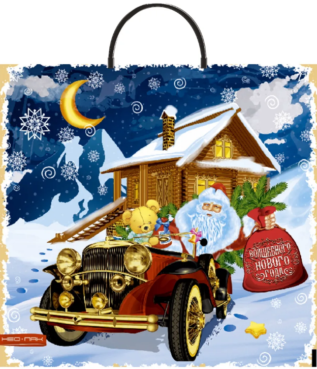 Пакет праздничный новогодний с пластиковой ручкой, размер 36*34*5 см. Используется как оригинальная удобная упавковка для подарка.