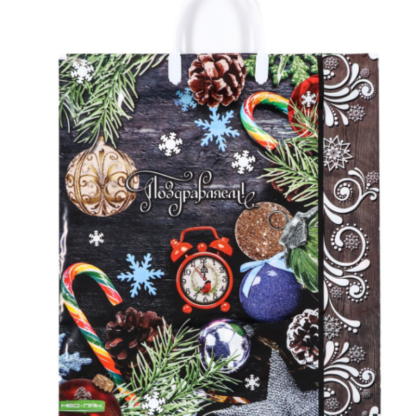 Пакет с пластиковой ручкой новогодней тематики, размер 38*44*5 см. Красивый плотный пакет подходит для использования в быту и как подарочная упаковка.
