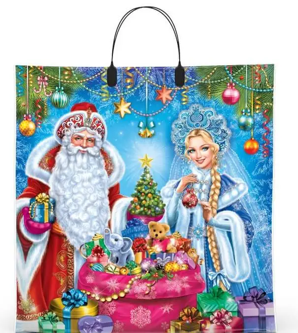 Пакет новогодний праздничный с пластиковой ручкой, размер 37*34*6 см. Красивый плотный пакет подходит для использования в быту и как подарочная упаковка. Продается по 10 штук.