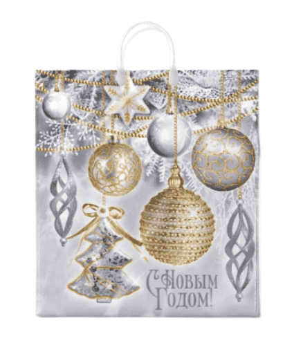 Новогодний пакет из мягкого пластика, размер 23*27+10см. Используется для упаковки подарка, а так же для бытовых нужд. Продается по 10 штук.