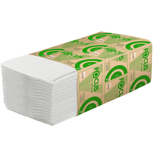 Бумажное полотенце Focus, 100 листов, Z сложение, двухслойное, в составе целлюлоза. Используется для поддержания гигиены в общественных местах.