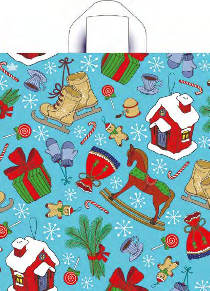 Новогодний пакет с петлевой ручкой 44*44см, 70мк. Используется для упаковки подарков, различных товаров. Продается по 25 штук.
