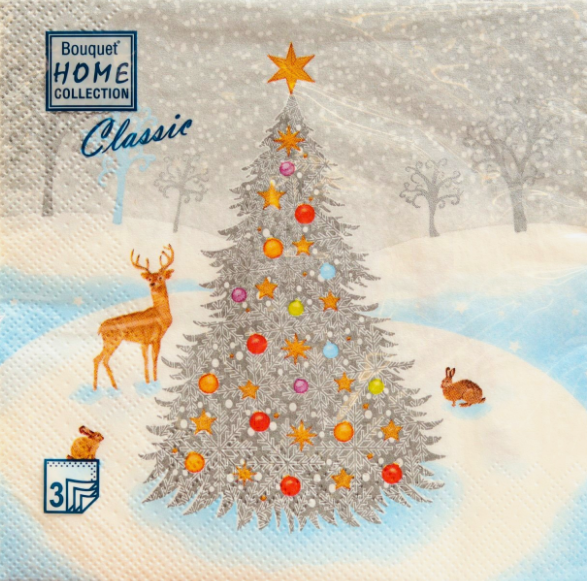 Новогодние бумажные 3-х слойные салфетки с нарядным принтом станут украшением для банкетов, фуршетов, праздничных столов дома. Количество салфеток в упаковке 12 штук.