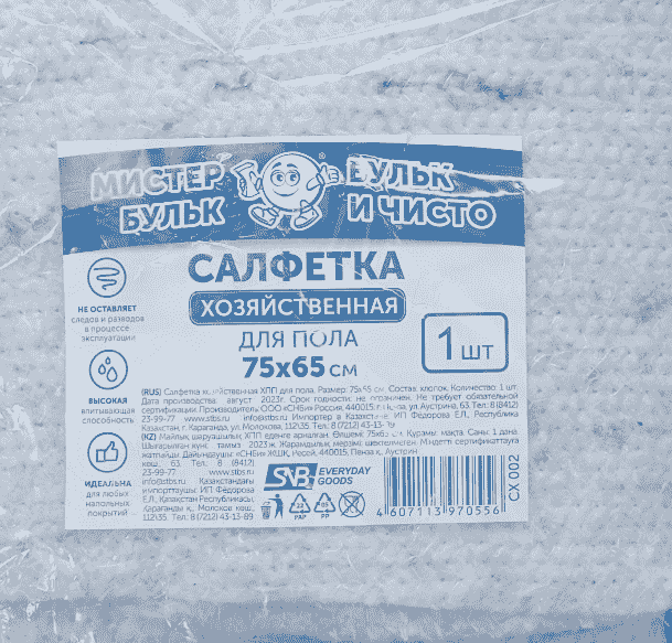 Салфетка для пола «Мистер Бульк» размером 75×65 см предназначена для уборки любых напольных покрытий. Она обладает высокой впитывающей способностью, не оставляет следов и разводов, быстро впитывает жидкости и высыхает.