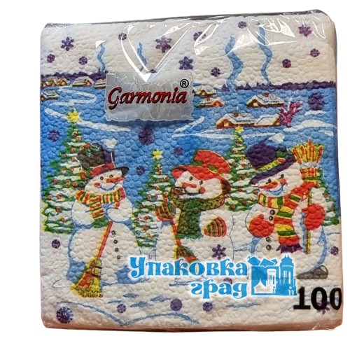 Салфетки бумажные однослойные 100 листов Снеговички. Необходимы для банкетов, фуршетов, для оформления праздничной сервировки стола.