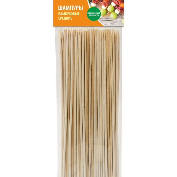 Шампуры из бамбука, длина 20см, количество в упаковке 100 шт. Используются для приготовления мини-шашлыков, овощей на гриле, углях, а так же в духовке, микроволновке. Экологически безопасны, не меняют вкус продуктов.